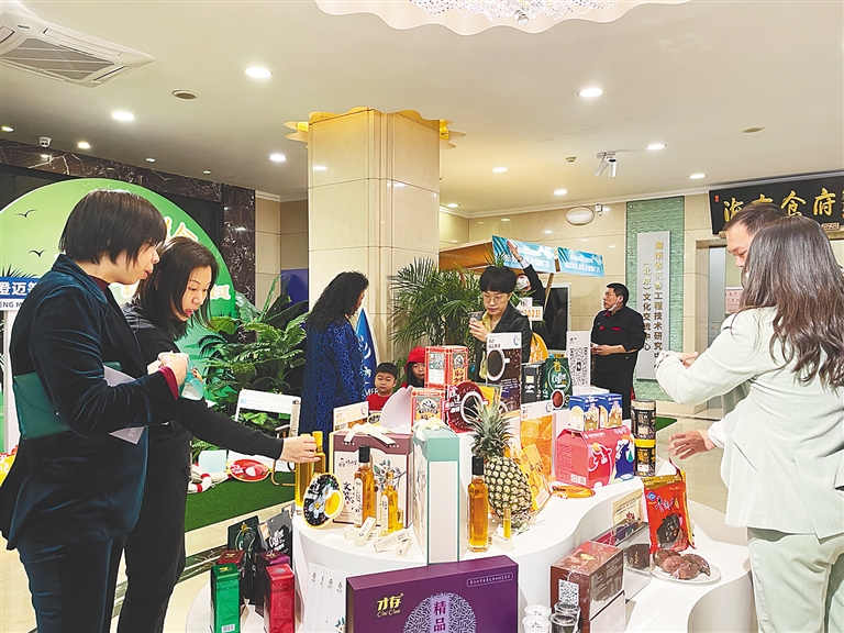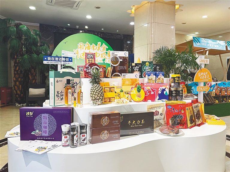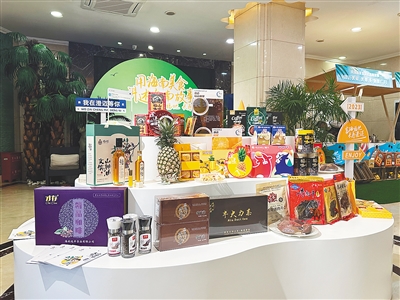 展厅内,摇曳的棕榈树下,独属于澄迈的特色农副产品高高垒起,香气萦绕鼻尖。