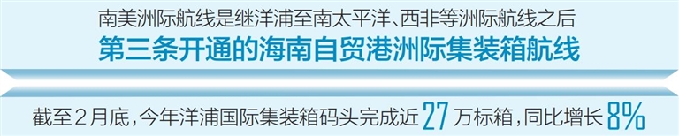 本报洋浦3月14日电(记者邵长春 林书喜 通讯员许琳祥 潘彤彤)海南日报记者从省交通运输厅获悉,3月13日,由中远海运集装箱运输有限公司运营、从巴西始发的南美洲际航线(ESA2)“新福州”轮顺利完成在洋浦国际集装箱码头的首次靠泊装卸并离泊。