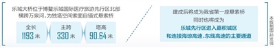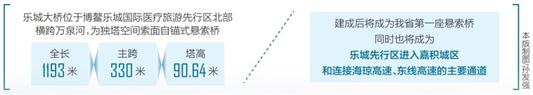 据介绍,乐城大桥位于博鳌乐城国际医疗旅游先行区北部,横跨万泉河,为独塔空间索面自锚式悬索桥,全长1193米,主跨330米,塔高90.64米。建成后,它将成为我省第一座悬索桥,同时也将成为乐城先行区进入嘉积城区和连接海琼高速、东线高速的主要通道。
