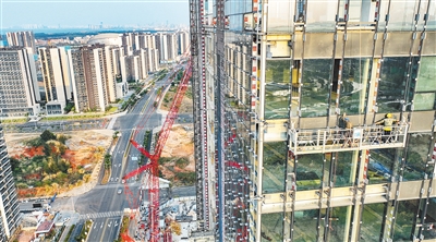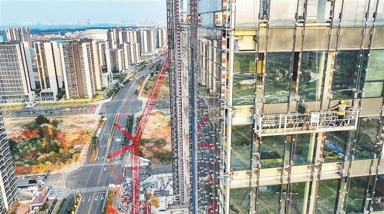 连日来,海口市复兴城互联网信息产业园二区复兴城国际数字港项目加快施工,工人在高空安装玻璃幕墙。