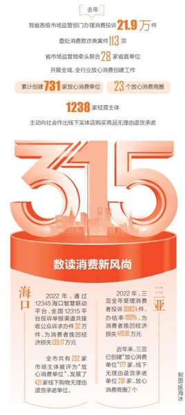 去年,我省各级市场监管部门办理消费投诉21.9万件,查处消费欺诈类案件113宗。围绕“安全放心、质量放心、服务放心、维权放心”的工作目标,省市场监管局牵头联合28家省直单位,开展全域、全行业放心消费创建工作,累计创建731家放心消费单位、23个放心消费商圈,1238家经营主体主动向社会作出线下实体店购买商品无理由退货承诺,在优化消费环境、畅通消费维权、激发消费潜力等方面取得积极成效。