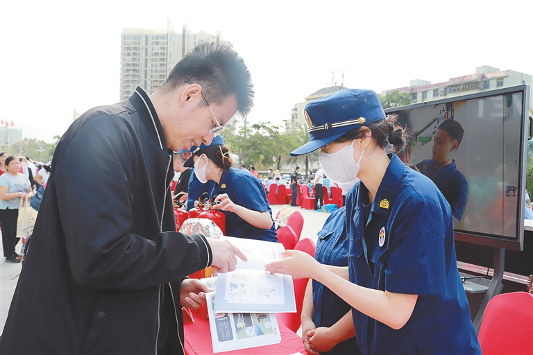 三亚市消防救援支队宣传员向市民普及消防产品知识。