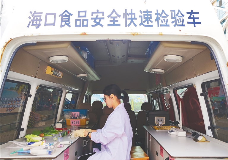 在海口市明珠广场,工作人员现场为市民提供食品检测服务。
