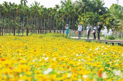 3月14日,在琼海博鳌南强·大路坡美丽乡村,游客在花海中拍照打卡。