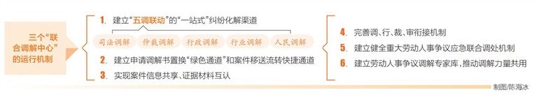 据了解,这三个“联合调解中心”的运行机制为:将按照“一窗受理”、共享调解资源、共享调解场所、开辟“绿色通道”的设置要求,建立司法调解、仲裁调解、行政调解、行业调解、人民调解等“五调联动”的“一站式”纠纷化解渠道;建立申请调解书置换“绿色通道”和案件移送流转快捷通道;实现案件信息共享、证据材料互认;完善调、行、裁、审衔接机制;建立健全重大劳动人事争议应急联合调处机制;建立劳动人事争议调解专家库,推动调解力量共用。