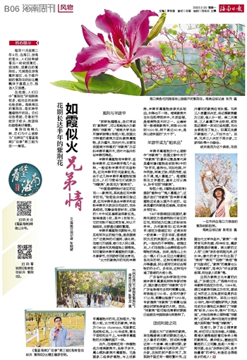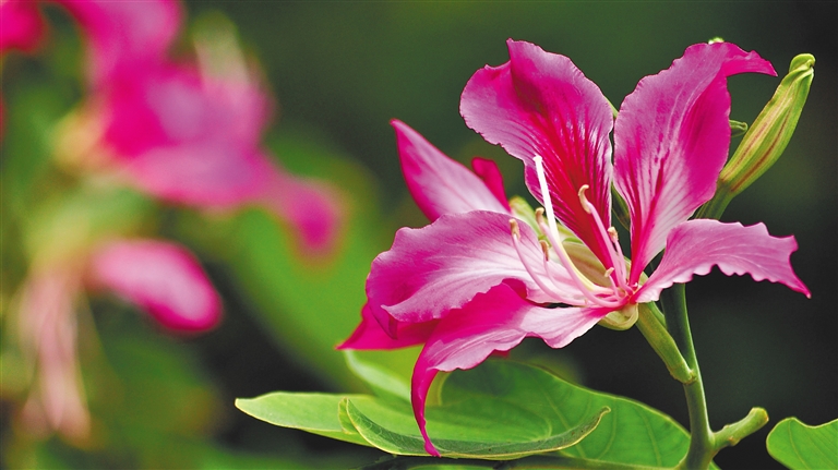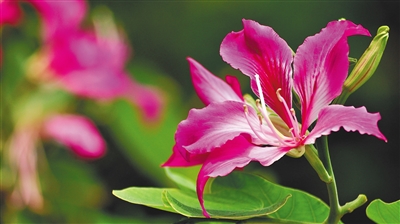 “中国香港特别行政区的区花——紫荆花,其实是红花羊蹄甲的花。”张哲告诉海南日报记者,红花羊蹄甲是由羊蹄甲和宫粉羊蹄甲天然杂交而成的,花朵具短柄,花瓣呈倒披针形,近轴的1片中间至基部呈深紫红色,能育雄蕊5枚,其中3枚较长。它的花粉不能正常发育,所以不能结实,主要通过插枝繁殖。