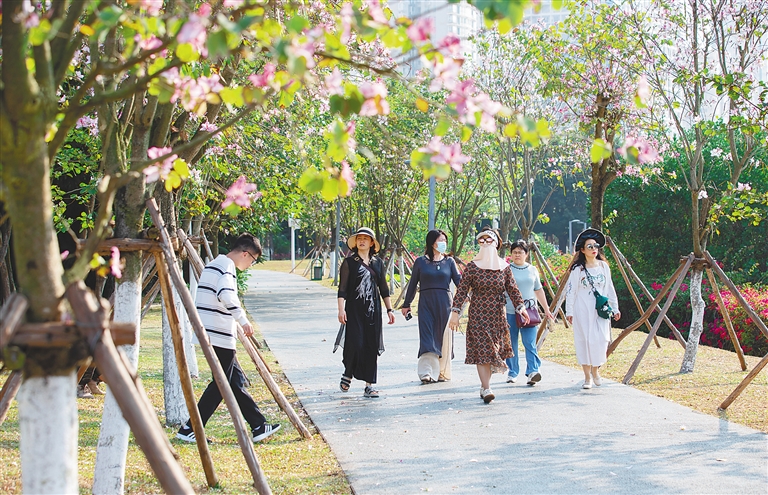 在海口,除了去公园赏紫荆,你还可以在龙华路、大园路、椰海大道等路段看见争奇斗艳的紫荆花。漫步街头,邂逅迎风飘落的二三花瓣,捡起一片闻一闻花香,念出“杂英纷已积,含芳独暮春”的诗句,你是否会想起故乡的故人?