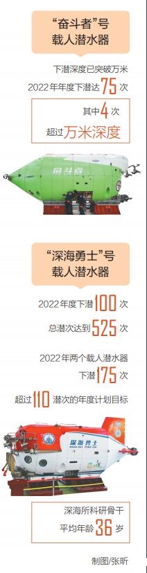 “奋斗者”号下潜深度已经突破万米,实现中国人征服了全球最深深渊的梦想;2022年年度下潜达75次,其中4次超过万米深度;“深海勇士”号载人潜水器2022年度下潜100次,总潜次达到525次。基于两台潜器的运维,锻炼出了一支高效的潜航员队伍。