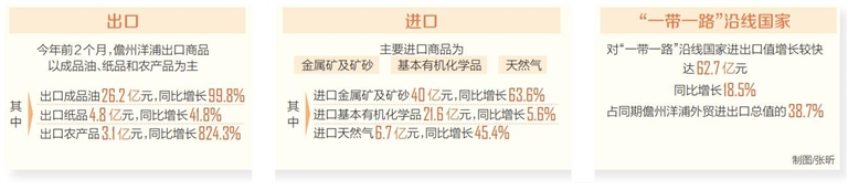 本报洋浦3月20日电 (记者林书喜 通讯员王冰雪 唐宇浩)3月19日,海南日报记者从洋浦经济开发区海关获悉,据海口海关统计,今年1月至2月,儋州洋浦货物贸易进出口值达162.2亿元,同比增长28.3%,占同期全省进出口总值47%,进出口值位列全省第一。其中,出口63.7亿元,同比增长44.6%;进口98.5亿元,同比增长19.6%。