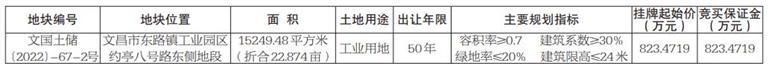 四、本次挂牌出让的详细资料和具体要求,见挂牌出让文件。申请人可于2023年3月21日至2023年4月18日从海南省建设用地使用权和矿业权网上交易系统(以下简称网上交易系统,网址:http://lr.hainan.gov.cn:9002)查看和打印或从文昌市自然资源和规划局自然资源权益和开发利用室或海口市美兰区蓝天路国机中洋公馆1B802领取纸质手册。并按挂牌出让手册的具体要求报名参加竞买。