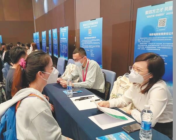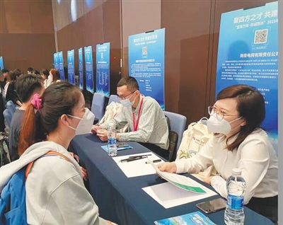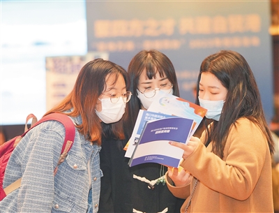 北京专场现场,求职者查看海南自贸港人才政策介绍。 本报记者 袁宇 摄