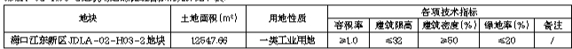 一、出让地块的基本情况和规划指标要求:(一)基本情况及宗地净地情况。本次挂牌出让的地块位于海口市江东新区JDLA-02-H03-2地块,面积为12547.66平方米(18.82亩),土地用途为一类工业用地,出让年限为50年。目前地块安置补偿落实到位、地上附着物已清表、土地权利清晰、无法律经济纠纷、土地开发利用规划条件明确、土壤无污染,具备动工开发所必需的条件。(二)主要规划指标。海口市江东新区JDLA-02-H03-2地块用地的规划指标情况详见下表: