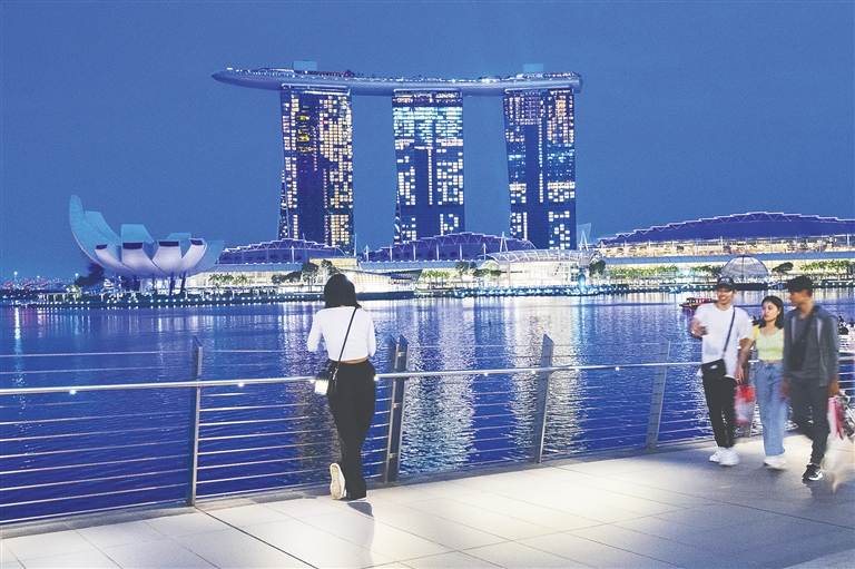 这是在新加坡拍摄的亮起蓝色灯光的建筑。新加坡的多处建筑于3月22日亮起蓝色灯光,以纪念世界水日。新华社发