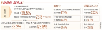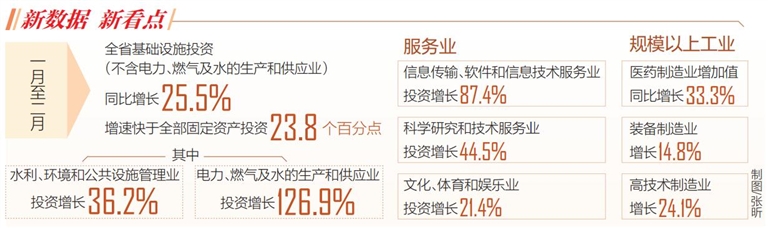 投资增速企稳回升,基础设施建设加快。1月至2月,全省固定资产投资同比增长1.7%,扭转了2022年的下降势头;两年平均增长8.9%。其中非房地产开发投资增长4.0%,非房投资占固定资产投资的比重较上年同期提高1.5个百分点。1月至2月,全省基础设施投资(不含电力、燃气及水的生产和供应业)同比增长25.5%,增速快于全部固定资产投资23.8个百分点,其中水利、环境和公共设施管理业投资增长36.2%。电力、燃气及水的生产和供应业投资增长126.9%。服务业投资中,信息传输、软件和信息技术服务业投资增长87.4%,科学研究和技术服务业投资增长44.5%,文化、体育和娱乐业投资增长21.4%,对全省固定资产投资带动作用明显。