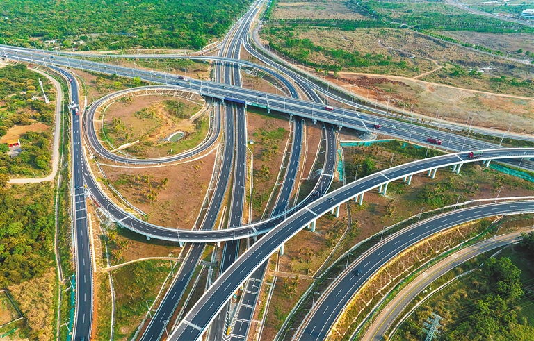 近年来,海南不断建设完善高速公路网,为加快推进、支撑全岛封关运作各项准备工作提供交通保障。据了解,截至2022年底,海南省高速通车总里程达到1397公里。图为3月20日,俯瞰沈海高速海口段和海南环岛高速交会处的粤海互通。