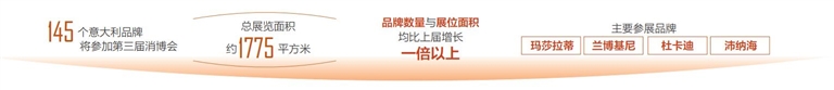 此外,中国意大利商会将与意大利驻华大使馆、意大利驻广州总领事馆和意大利对外贸易委员会,协同组织“意大利企业馆”,该馆为意大利国家馆的一部分。中国意大利商会积极推动意大利企业和品牌参加消博会“意大利企业馆”的展示,以提升优质意大利品牌的影响力,带来的品牌涵盖珠宝首饰、服饰、眼镜,食品和饮料,冰淇淋设备、摩托车等品类。