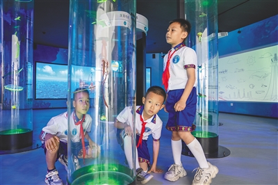 3月22日,五指山市科技馆开馆。在展馆海洋世界展区,海洋生物模型引起小学生的关注。据悉,五指山市科技馆是海南省首座县级标准化科技馆,馆内设置海洋世界、太空探索、基础力学、人工智能、炫酷科技等5大主题展区,常设展品有113件。本报记者 李天平 摄