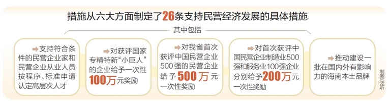 本报海口3月25日讯(记者陈彬)日前,省政府办公厅印发关于支持民营经济发展的若干措施的通知,公布了《关于支持民营经济发展的若干措施》(以下简称《措施》),从全面提振民营经济发展信心等六大方面制定了26条支持民营经济发展的具体措施,推动民营企业提振信心、转型升级、健康发展,深度融入海南自由贸易港建设。《措施》自公布之日起施行,涉及财政资金奖补措施执行至2025年底。
