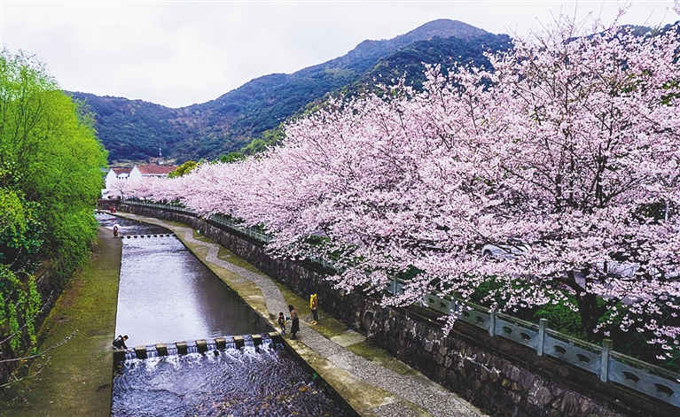 3月25日,游客在浙江省宁波市北仑区大碶街道和鸽村欣赏盛开的樱花。