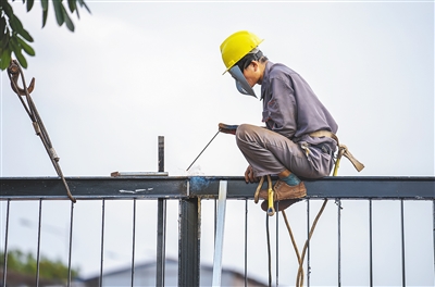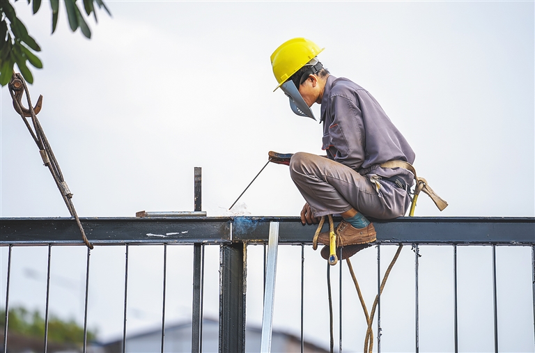 近日,在海口国家高新区美安生态科技新城内的华熙生物产业园项目建设现场,工人在焊接围栏。据了解,该项目通过倒排工期、穿插施工等举措抢抓进度,目前一期示范车间、中试车间等4栋单体建筑已基本完工。华熙生物科技产业园主要承载药械、再生医学、国际业务三大业务板块,将致力于生物科技领域的技术创新和发展升级。