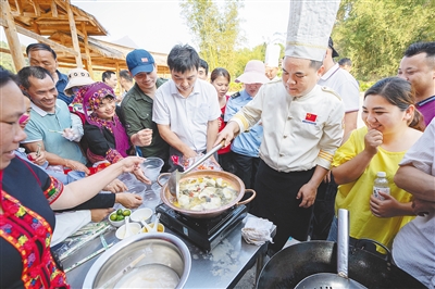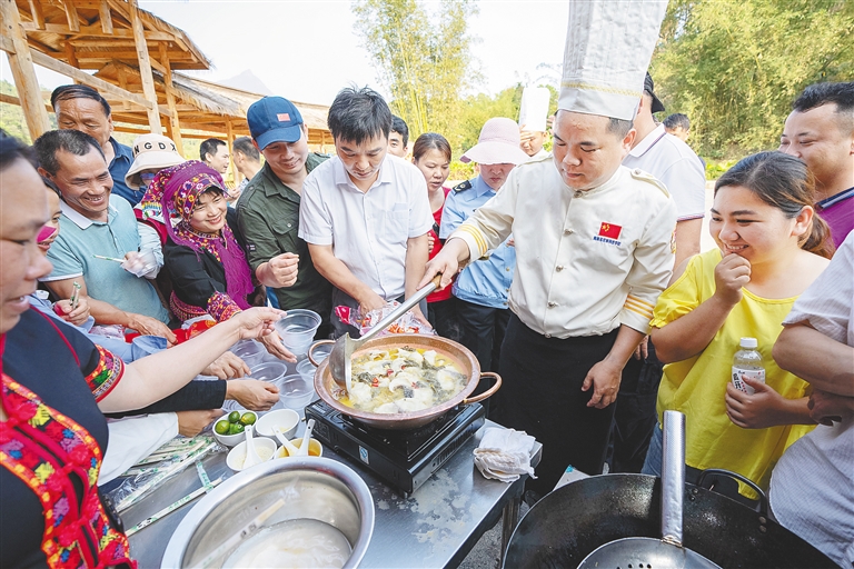 3月22日,五指山市有关部门在水满乡毛纳村举办酸汤鱼烹饪规程推广培训活动,烹饪老师教村民学习制作酸汤鱼的技巧。