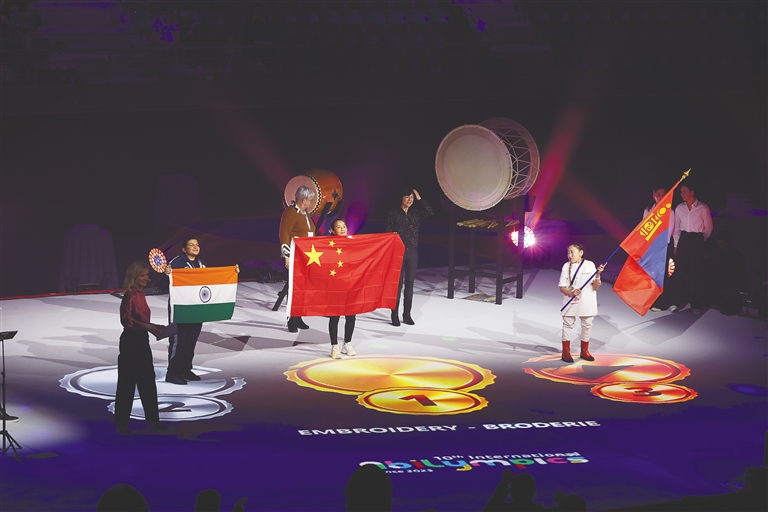 第十届国际残疾人职业技能竞赛于当地时间25日晚在法国梅斯落幕,来自中国代表团的29名选手参加了9个类别20个项目的竞赛,获得6金7银7铜的成绩。图为在刺绣比赛中夺冠的中国选手布云秀上台领奖。新华社发