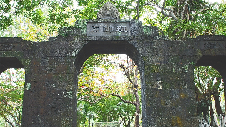在海口市人民公园里,便有一座班帅庙。其实只能说它曾是座“班帅庙”,因为目前只剩一座山门了。这座班帅庙的山门修得很巍峨,三门四坊,石雕精美。这座曾经的庙宇在明代的正德《琼台志》中有记载:“班帅堂,在大英村(人民公园历史上属于大英村,公园便是依此村所在的大英山而建成)。其神即灵山祠第六位也。”