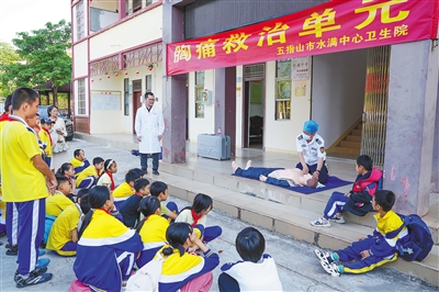 3月23日,在五指山市水满中心学校,水满中心卫生院的医护人员给学生们教授急救知识和技巧。近年来,五指山市为提高师生员工的安全防范意识、应急处置能力,多次组织学校开展应急救护能力培训,并在全市中小学校配备AED自动体外除颤仪,提升自救互救能力。本报记者 李天平 摄