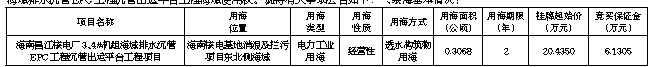 根据《中华人民共和国海域使用管理法》《海南省实施〈中华人民共和国海域使用管理法〉办法》和《海南省海域使用权审批出让管理办法》及有关法律法规规定,经昌江黎族自治县人民政府批准,昌江黎族自治县行政审批服务局决定以挂牌方式公开出让海南昌江核电厂3、4#机组海域排水沉管EPC工程沉管出运平台工程海域使用权。现将有关事项公告如下:一、宗海基本情况: