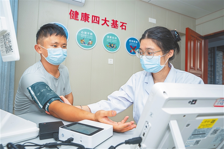近日,在琼海市博鳌镇沙美村卫生室的5G诊室,全科医生用“健康一体机”为村民检查身体状况。医生将检查结果上传后,实时发起了远程诊断,仅用时3分钟就得到了琼海市三甲医院专家助诊,并对诊断结果进行了确认。