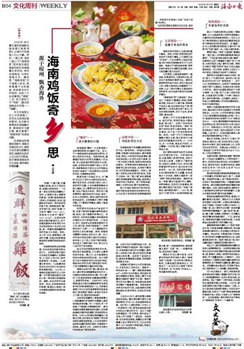 日久他乡是故乡。昔日,鸡饭是客居或侨居各地的海南人慰藉乡愁的乡味;而今,鸡饭随着海南人在异乡落地生根,各具特色。冠以“海南”二字的鸡饭,永远指向这道佳肴的源头和来路。1986年,新加坡《新明日报》刊载《文昌鸡》一文称,以往文昌鸡饭在香港的海南人开设的店中最是吃香,后来为了方便不熟悉海南地理的香港本地人识别,才改称之为“海南鸡饭”。这应是海南人做的鸡饭在岛外得名为“海南鸡饭”的其中一个缩影吧。