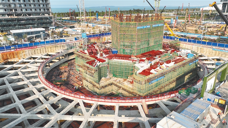 近日,位于海口江东新区总部经济区(生态CBD)的中国石化自贸大厦项目工地,工人们正抓紧进行核心筒地上部分和裙楼地下部分的施工。据了解,该项目建成后,将利用海南自贸港政策优势和区位优势,开展能源国际贸易、跨境电商、新能源研究与开发等业务。本报记者 张茂 摄