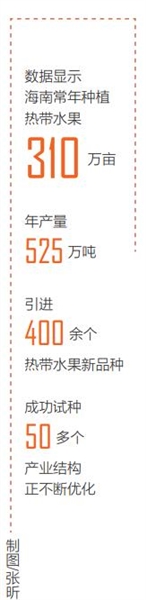 数据显示,海南常年种植热带水果310万亩、年产量525万吨,引进400余个热带水果新品种,成功试种50多个,产业结构正不断优化。在海口、三亚、琼海等市县先行先试开展热带果蔬展示示范工作,推进榴莲、菠萝蜜、释迦、红毛丹、黄晶果等品种示范种植。