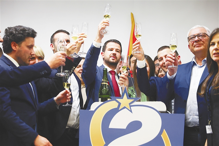 图为4月2日,在黑山波德戈里察,雅科夫·米拉托维奇(中)在第二轮投票后庆祝。新华社/路透