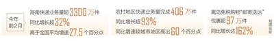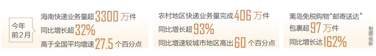 省邮政管理局相关负责人表示,今年1月至2月,海南快递业务量超3300万件,同比增长超32%,接近同期全国服务业生产指数同比增速的6倍。