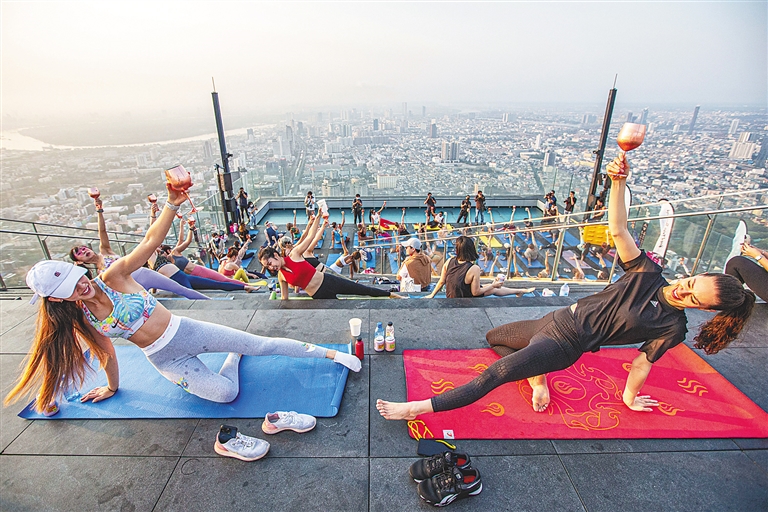 当日,数十名瑜伽爱好者在曼谷王权云顶大厦顶层观景平台体验高空瑜伽。新华社发