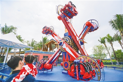 3月22日,三亚丝路世界景区内,游客们正排队体验太空星云项目。该项目引进的太空星云大型游乐设施,是海南自贸港自用生产设备“零关税”政策升级后的首票业务。