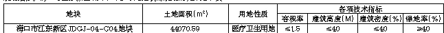 经海口市人民政府批准,海口市自然资源和规划局决定以挂牌方式出让一幅海口市江东新区JDGJ-04-C04地块的国有建设用地使用权。现将有关事项公告如下:一、出让宗地的基本情况和规划指标要求:(一)基本情况及宗地净地情况。本次挂牌出让的用地位于海口市江东新区JDGJ-04-C04地块,土地面积为44070.59平方米(66.11亩),土地用途为医疗卫生用地,土地出让年限50年。目前地块安置补偿落实到位、地上附着物已清表、土地权利清晰、无法律经济纠纷、土地开发利用规划条件明确、土壤无污染,具备动工开发必需的条件。(二)主要规划指标。海口市江东新区JDGJ-04-C04地块的规划情况详见下表: