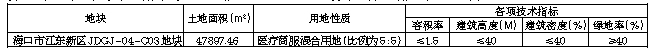 经海口市人民政府批准,海口市自然资源和规划局决定以挂牌方式出让一幅海口市江东新区JDGJ-04-C03地块的国有建设用地使用权。现将有关事项公告如下:一、出让宗地的基本情况和规划指标要求:(一)基本情况及宗地净地情况。本次挂牌出让的用地位于海口市江东新区JDGJ-04-C03地块,土地面积为47897.46平方米(71.85亩),该宗地用地四至及界址坐标详见地块勘测定界图,土地用途为医疗卫生和其他商业服务业用地(医疗卫生用地占50%,其他商业服务业用地占50%),土地出让年限为医疗卫生用地50年,其他商业服务业用地40年。目前地块安置补偿落实到位、地上附着物已清表、土地权利清晰、无法律经济纠纷、土地开发利用规划条件明确、土壤无污染,具备动工开发必需的条件。(二)主要规划指标。海口市江东新区JDGJ-04-C03地块用地的规划指标情况详见下表: