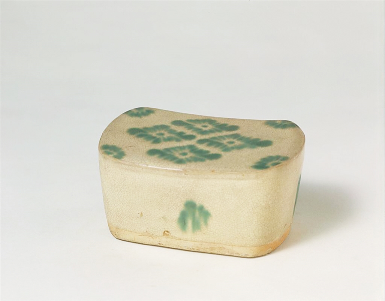 黄道婆宋末元初推广纺织技术后,棉纺织业快速发展。到了明代,我国的布艺品日渐丰富,于是布艺枕开始涌现和普及。相较于之前的瓷枕,明代的瓷枕瓷质更加致密,有青花装饰,还有粉彩、三彩、五彩装饰。海南省博物馆收藏的明代三彩枕,侧面呈船形,中空,正面施绿黄釉,呈“凹”形,上有云纹。该瓷枕形状按人体生理机构设计,刚好托住颈曲,有助于睡眠。这一时期,虽然瓷枕制作工艺有所进步,但已经开始被布艺枕替代。因为布艺枕色彩鲜艳、纹饰华美、更加舒适,而且易于制作。