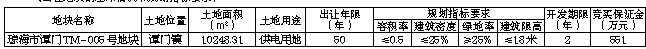 根据琼海市人民政府《净地条件核定表》,琼海市潭门TM-005号地块土地权利清晰、安置补偿落实到位、地上附着物清表、无法律经济纠纷、土地开发利用规划条件明确、符合土壤环境质量要求、具备动工开发所必需条件。按照《海南省自然资源和规划厅 海南省发展和改革委员会 海南省农业农村厅 海南省工业和信息化厅 海南省商务厅 海南省财政厅 国家税务总局海南省税务局关于印发〈海南省产业用地控制指标〉的通知》(琼自然资用〔2023〕12号)有关规定,该宗土地不设定投资强度、年度产值和税收指标。