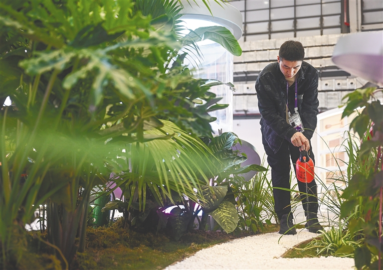 工作人员为种植在消博会展台上的绿植浇水。 本组图片除署名外均由新华社发