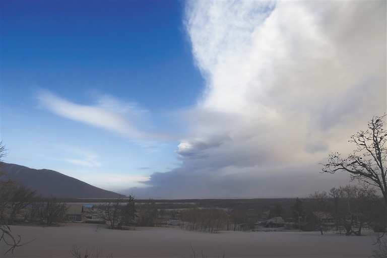 图为在俄罗斯远东堪察加半岛克柳奇村拍摄的火山喷发后的景象。