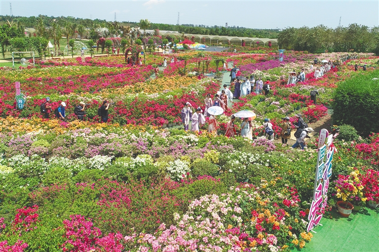 4月的琼山,花香四溢。在红旗镇,近千亩的三角梅将道崇村扮靓,游客来一批又一批。“我们致力于打造‘看花海、走花道、闻花香、品咖啡、购花物、爱花屋’的沉浸式体验之旅,让赏花游成为乡村振兴的新引擎。”三角梅共享农庄负责人吴林桥介绍,从春节至今,农庄每天均吸引上千名游客。游客的到来也让农庄所在的道崇村各类农产品大销,一个又一个农业产业项目涌出。