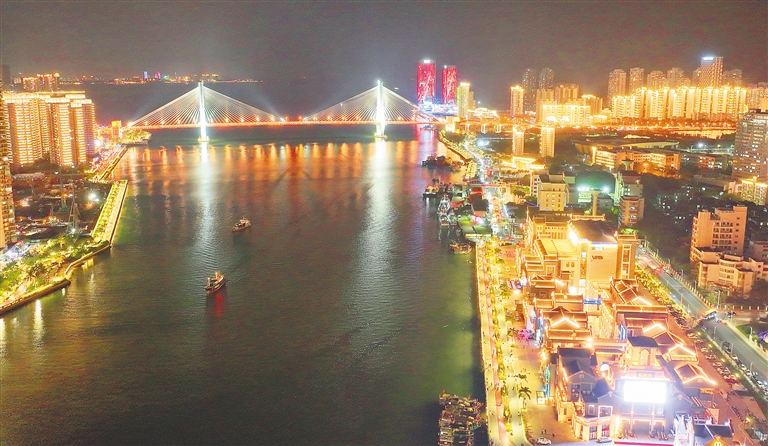 暮色四合之时,海口海甸溪北岸,灯光星星点点地串起了沿岸夜色美景——