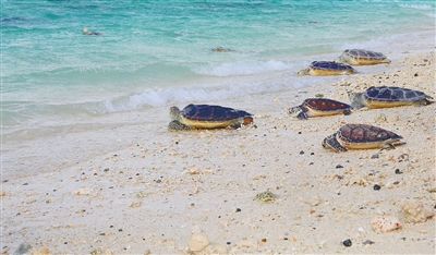 海龟保护是七连屿海洋生态环境保护的一项重要工作。为了保护西沙诸岛周边的渔业资源,三沙鼓励渔民转产上岸,将渔民安排到岛礁巡护、港务站、岛上绿化等岗位。