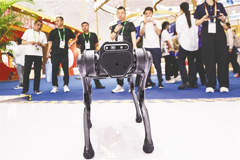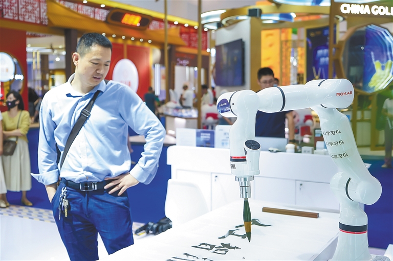 在8号馆国货精品展区,不少家长带着孩子在科大讯飞展位有序排队,“能不能让机器人给我写金榜题名四个字”。只见AI书法机器人“手执”毛笔,在纸上勾画、停顿、转折,很快便写好一幅字。