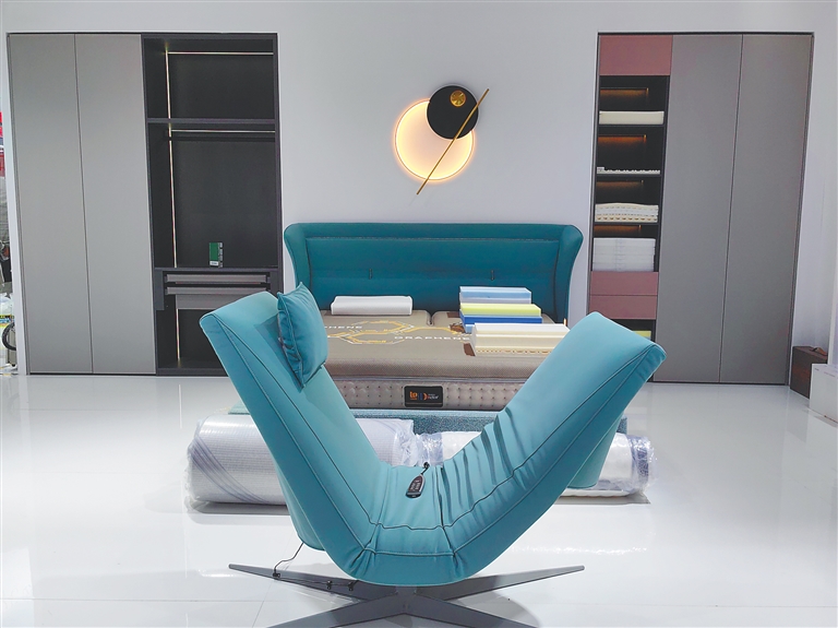 居家生活的幸福感,离不开一个个小细节。在消博会6号馆湖北省展区内,乔木森(中国)家具公司分别展示了一款可折叠的沙发床和床垫,沙发床可从180度折叠到近60度,床垫也可实现床头床尾的自动折叠,并提供睡眠时的呼吸与心率监测,可以极大缓解使用者腰部与腿部的压力。