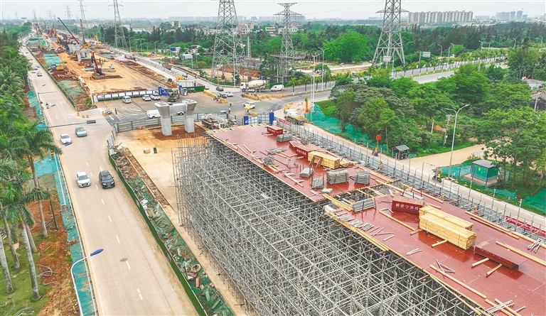 近日,海口江东新区美兰机场快速通道项目施工现场一派繁忙,工人在加紧进行钢模搭建。该项目全线主要采用高架快速路形式,设计速度为80公里/小时。项目按计划9月底通车后,将有效缩短美兰机场与琼北地区车行时间。本报记者 张茂 摄