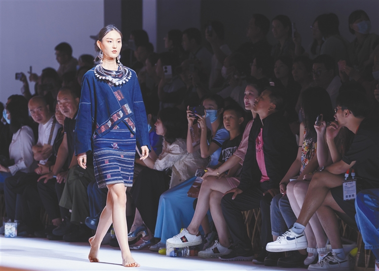 时装秀分为上下两场,其中上半场是传统黎族服饰以及加入现代元素的改良版黎族服饰,下半场展示了极简设计的现代服装,黎锦与现代元素的融合设计给观众带来了不一样的享受与启发,同时也为传统手工艺品产业化发展带来了新思路。